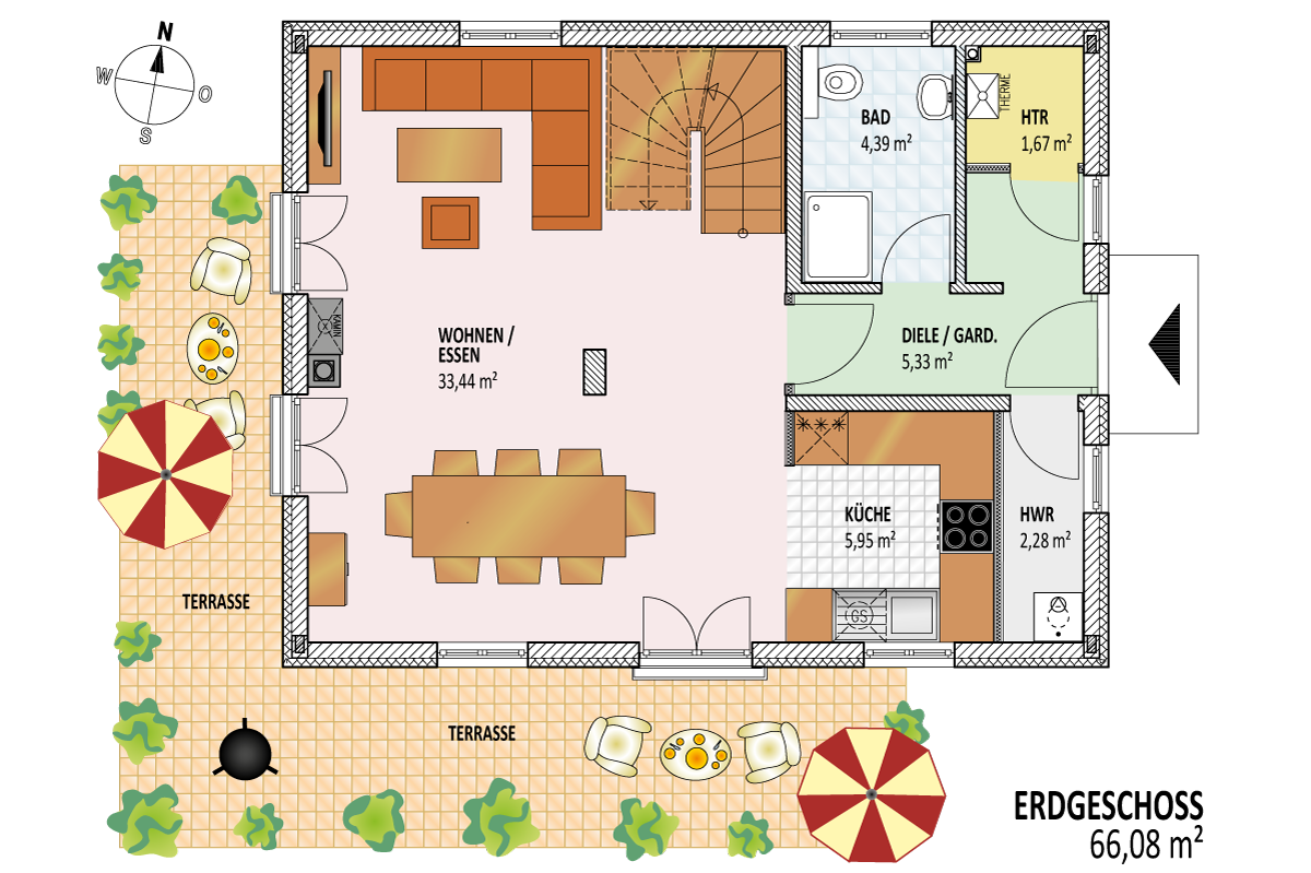 - 2 Terrassen am Haus, ausgerichtet nach Süd-und Westrichtung, Gartenmöbel,