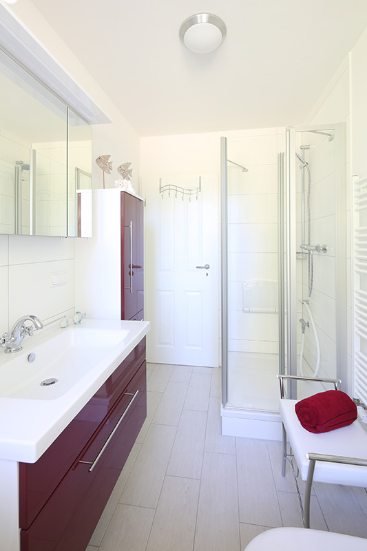 Im Erdgeschoss befindet sich ein Bad mit Dusche und Klappsitz sowie eine Vorrichtung für Kneipp- Güsse.