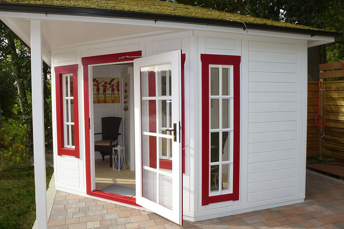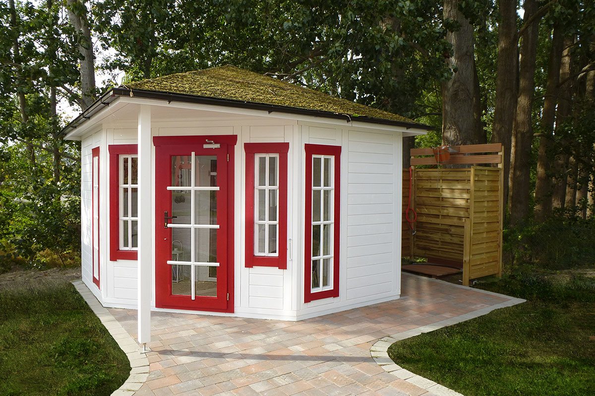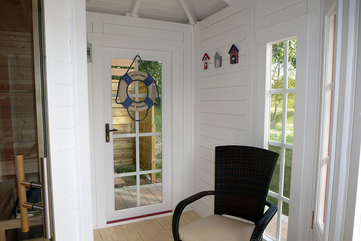 Im Garten befindet sich das Saunahaus mit finnischer Sauna und Eimer-Schwalldusche im Freien.